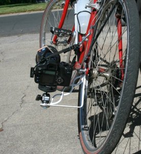 This photo was taken with a remote setup. My Canon Digital Rebel XT was mounted on a bracket attached to the rear axle of the bike. The camera was remotely triggered with a radio trigger in my right hand. The bracket was made from a shelf bracket I picked up at Home Depot. I drilled out the holes so I could attach one end of the bracket to the bike axle and the other end holds a ball-head for adjusting the camera. (You can click on the photos to see a larger image.)